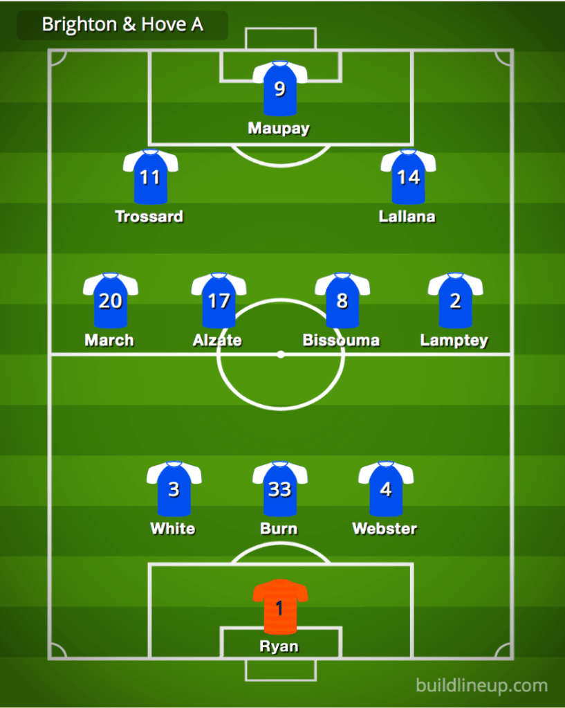 In the middle, Yves Bissouma’s partner is likely to be Steven Alzate, while Leandro Trossard and Adam Lallana are likely to keep their places further up the pitch.