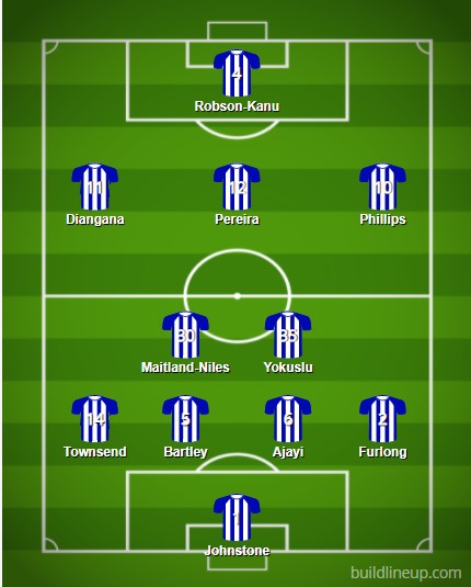 Hal Robson-Kanu is likely to keep his place in the starting XI having beaten eventual matchwinner Alisson with a composed finish. Though Karlan Grant did make a rare appearance against Jurgen Klopp’s side, so a return for him cannot be discounted.
