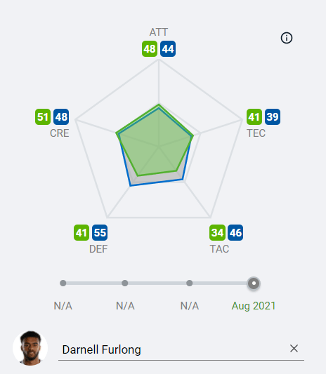 Laird also impressed on loan at MK Dons last season, notching three assists across 24 appearances. Indeed, Laird impressed most with his attacking output, averaging over one key pass per game (1.1), compared to Furlong’s 0.8 in the Championship (19/20). In fact, according to SofaScore, Laird ranks higher than Furlong in an attacking sense, creatively and tactically.